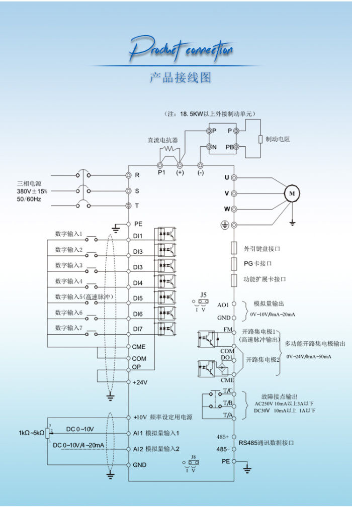 4.多種速度控制方式:模擬量輸入0-5VDC,0-10VDC,0/4-20mA;面板電位器調速(更改參數可設置上下按鍵調速);外接電位器調速;可通過485通訊調速。